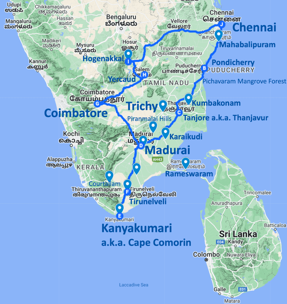 Below is a map of South India, focusing particularly on Tamil Nadu and Pondicherry, to help orient the reader on the itinerary plan that is to follow.